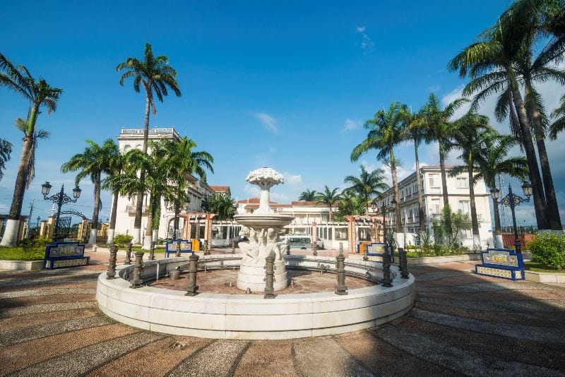 A Praça de África é o centro pulsante de Malabo. Com suas árvores frondosas e fontes dançantes, ela oferece um respiro no meio da correria urbana. É aqui que os locais se reúnem para conversar, vender seus produtos ou simplesmente relaxar. A praça é cercada por edifícios históricos que contam um pouco da história colonial da cidade, e sua atmosfera é uma mistura vibrante de passado e presente. O clima quente e úmido da cidade parece ser suavizado pela brisa que corre por aqui, tornando a visita ainda mais agradável. Para quem quer sentir o pulso de Malabo, não há lugar melhor.
