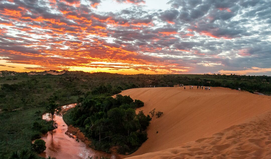 As Dunas do Jalapão são um verdadeiro espetáculo visual. O contraste entre o amarelo dourado da areia e o azul do céu cria um cenário de tirar o fôlego. Subir até o topo das dunas é uma experiência que exige fôlego, mas a recompensa é mais do que gratificante. De lá, a vista se estende por quilômetros, revelando a imensidão do cerrado e o que parece ser um mar de areia. O som da brisa, o cheiro da terra seca e a sensação de liberdade tornam esse lugar inesquecível.