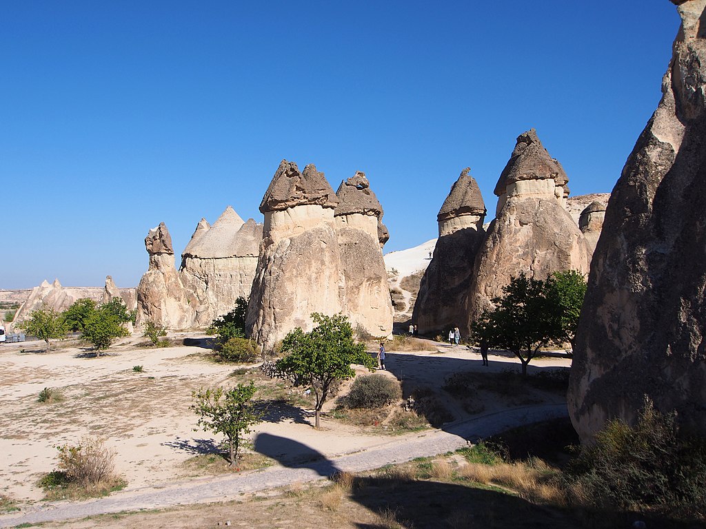 O Vale dos Monges, ou Pasabag, é outro espetáculo da Capadócia. Aqui, as famosas “chaminés de fada” se erguem do solo como gigantes de pedra, com suas formas curiosas que mais parecem saídas de um sonho. Ao caminhar entre elas, é impossível não sentir a grandiosidade do lugar. É um cenário perfeito para fotos que mais parecem montagens de tão surreais. Dizem que essas formações rochosas foram moldadas pela erosão ao longo de milhares de anos, mas quem sabe, né? Às vezes, parece que elas foram feitas por mãos divinas. E, sim, a vista do topo do vale é de cair o queixo.